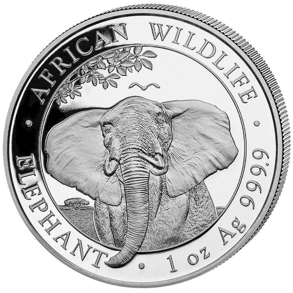 Серебряная инвестиционная монета 2021 года из серии «Дикая природа Африки» посвящена величественному сомалийскому слону. Она отчеканена из серебра высшей пробы и продолжает традицию ежегодно меняющегося дизайна. На реверсе изображен выразительный портрет взрослого слона на фоне африканской степи — его хобот словно выходит за пределы поля монеты, создавая впечатляющий эффект глубины.