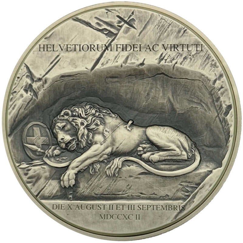 Эта уникальная монета изготовлена по инновационной технологии Bi-Metal Max от PMC и объединяет унцию серебра с пятью унциями меди. На её реверсе изображён умирающий лев, склонивший голову на щит с изображением лилии — символом французской монархии, а над ним размещён герб Швейцарии, олицетворяющий доблесть и верность швейцарских гвардейцев. Монета выпущена в честь 200-летия открытия памятника, созданного в память о героях, павших при защите Тюильрийского дворца во время Великой Французской революции. Каждый экземпляр поставляется в оригинальном футляре с сертификатом подлинности. Лимитированный тираж — всего 300 штук по всему миру.