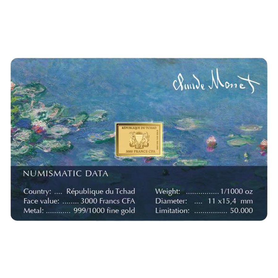 Чад: коллекционная золотая монета Клод Моне. Кувшинки, 0,031 г чистого золота (0,999)