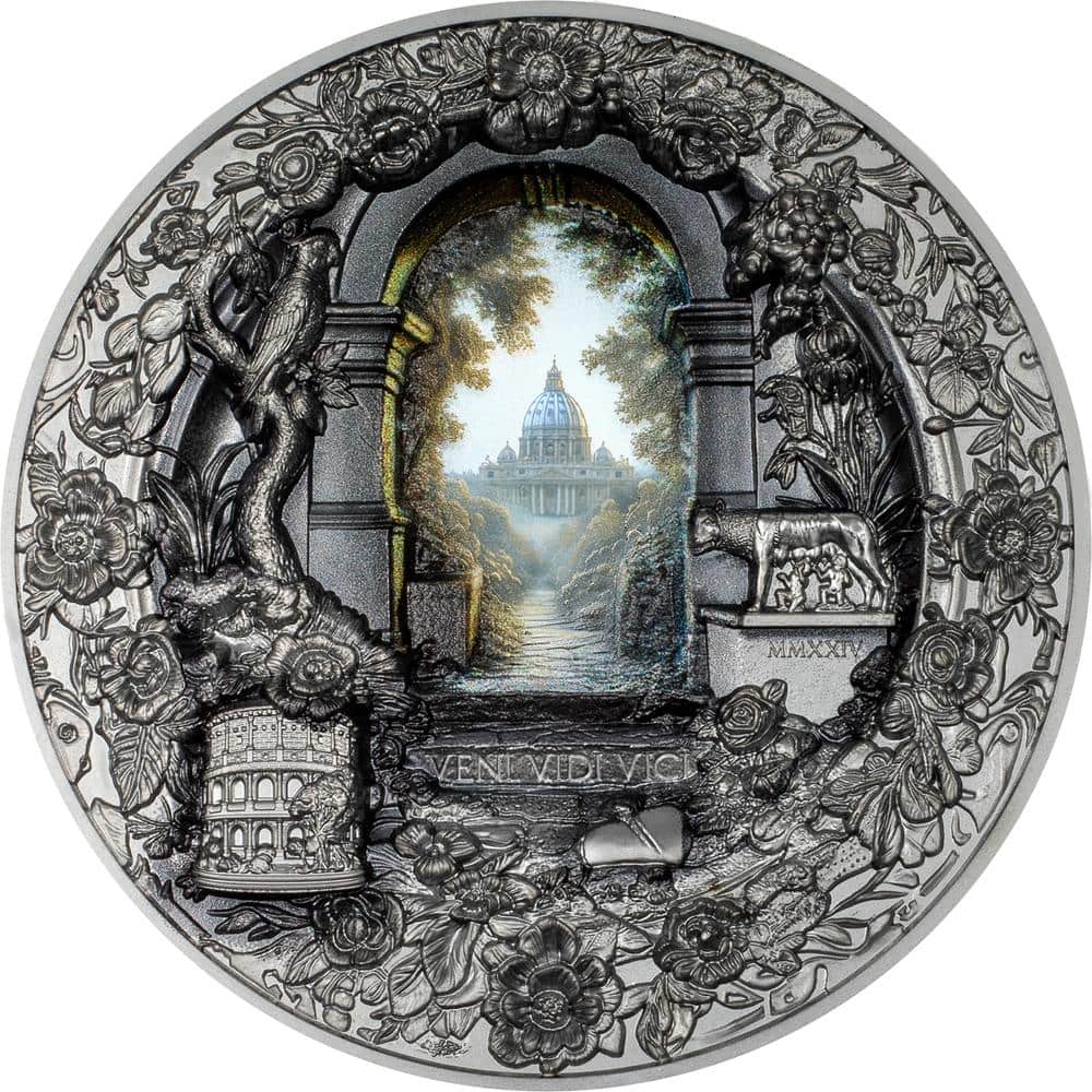 Эта впечатляющая серебряная монета весом 3 унции входит в серию «Монументальный вид», посвящённую знаковым достопримечательностям Италии. В центре композиции раскрывается изысканный архитектурный образ Рима: величественный собор Святого Петра, словно увиденный сквозь легендарную арку-«замочную скважину» Мальтийского ордена, окружённый символами Вечного города. Монета выполнена в качестве Black Proof, которое подчёркивает глубину дизайна и контраст форм. Поставляется в футляре с сертификатом подлинности. Ограниченный тираж — 499 экземпляров по всему миру.