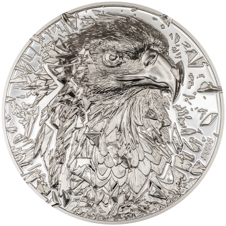 Эта впечатляющая серебряная монета весом 3 унции входит в серию «Серебряный взрыв» и посвящена белоголовому орлу. На реверсе представлена выразительная голова орла, прорывающаяся сквозь эффект разбитого стекла, что усиливает ощущение силы, динамики и непреклонного характера птицы. Монета выполнена в качестве Proof с применением технологии Smartminting и поражает сверхвысоким рельефом, подчёркивающим текстуру перьев и пронзительный взгляд хищника. Поставляется в элегантном футляре с сертификатом подлинности и имеет ограниченный тираж в 999 экземпляров.
