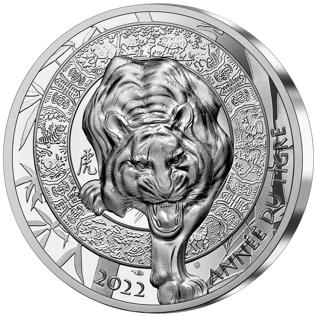 Франция: коллекционная серебряная монета Год Тигра 2022 Proof, 31,1 г чистого серебра (0,999)