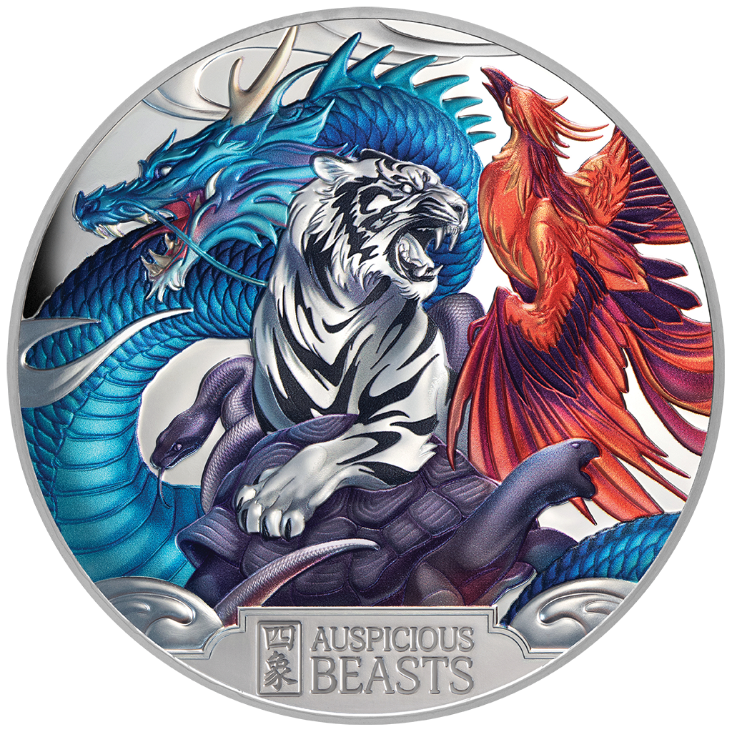 Эта впечатляющая серебряная монета весом 5 унций воплощает дух древних мифов и силу четырёх Благоприятных Зверей — Лазурного дракона, Алой птицы, Белого тигра и Чёрной черепахи. Их динамичные образы объединены в мощной композиции, где тёплые огненные оттенки переплетаются с холодной синевой. Выполненная в качестве Proof, монета поражает глубиной рельефа и игрой света, подчёркивающей каждую деталь легендарных стражей. Она поставляется в элегантном футляре и сопровождается сертификатом подлинности. Тираж строго ограничен — всего 388 экземпляров по всему миру.