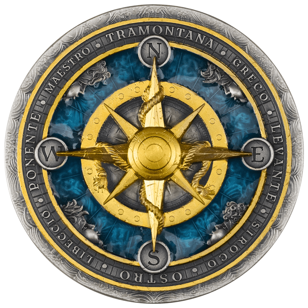 Ниуэ: коллекционная серебряная монета Роза ветров 2026 (позолота, цвет), 62,2 г чистого серебра (0,999)