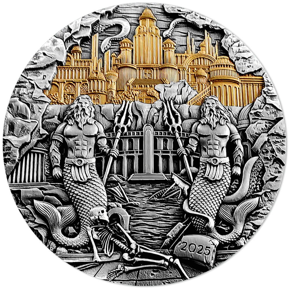 Самоа: коллекционная серебряная монета Атлантида 2025 (позолота), 155,5 г чистого серебра (0,999)