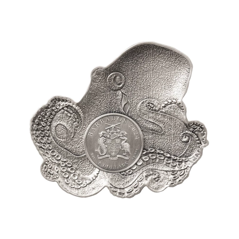 Серебряная монета Барбадоса Осьминог 2024 Proof цвет 3 oz