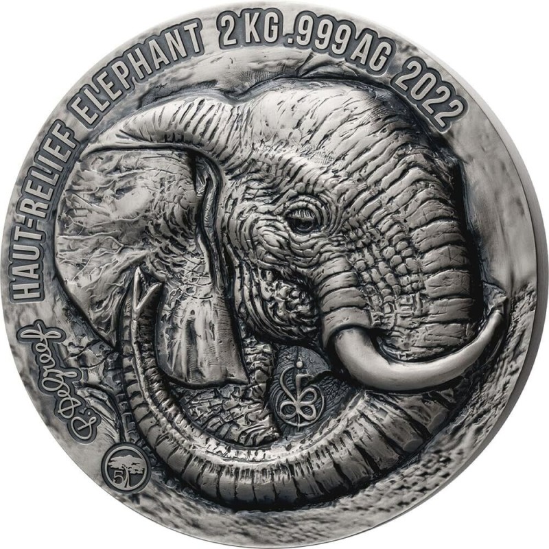 Республика Кот-д’Ивуар: коллекционная серебряная монета Большая Пятерка. Слон 2022, 2000 г чистого серебра (0,999)