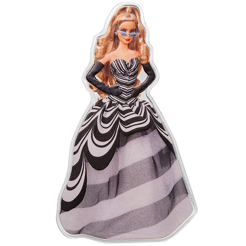 Эта изысканная серебряная монета весом 1 унция выпущена в честь 65-летия Барби и посвящена культовой кукле из специальной серии «Синий сапфир». Монета выполнена в форме силуэта Барби, отличается яркой цветной отделкой и эффектным дизайнерским исполнением. В композиции отражён узнаваемый стиль легендарной куклы — элегантное черно-белое платье с выразительным узором и модные солнцезащитные очки. Монета поставляется в футляре с сертификатом подлинности. Тираж строго ограничен и составляет всего 3000 экземпляров.