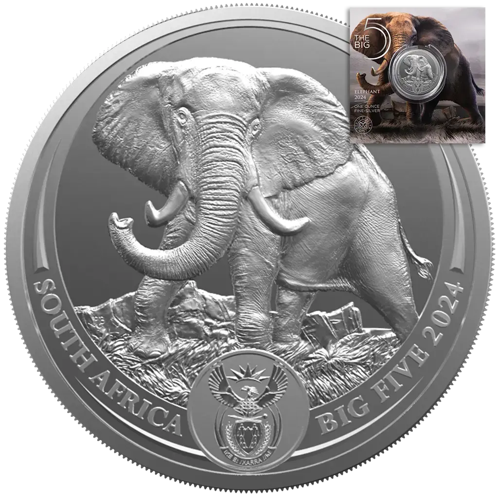 ЮАР: коллекционная серебряная монета Большая пятерка III. Слон 2024, 31,1 г чистого серебра (0,999)